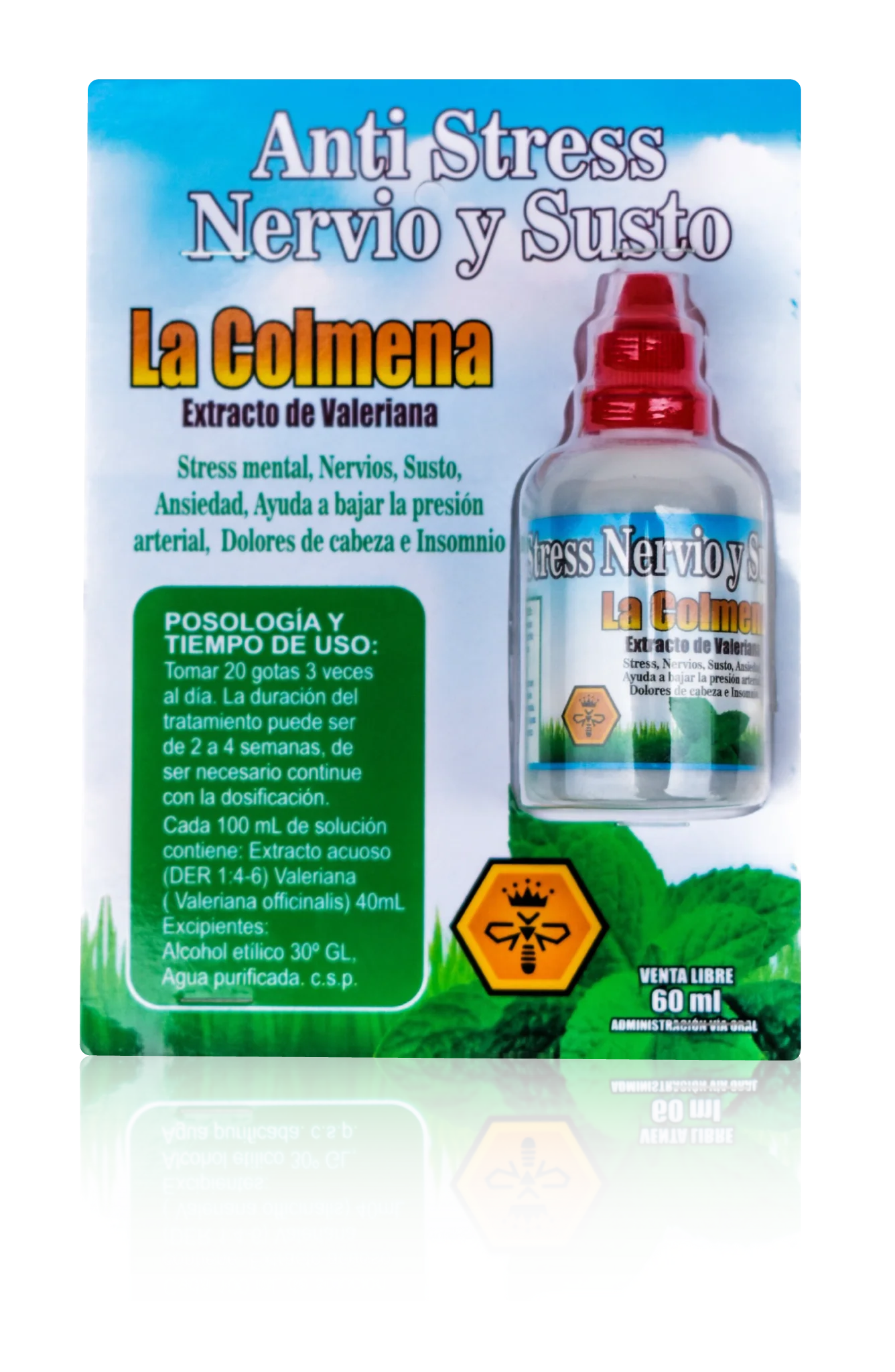 Anti Stress Nervio y Susto Gotero 60ml de La Colmena alivia estrés, nervios, ansiedad y ayuda a dormir mejor con extracto de valeriana, tilo y menta.