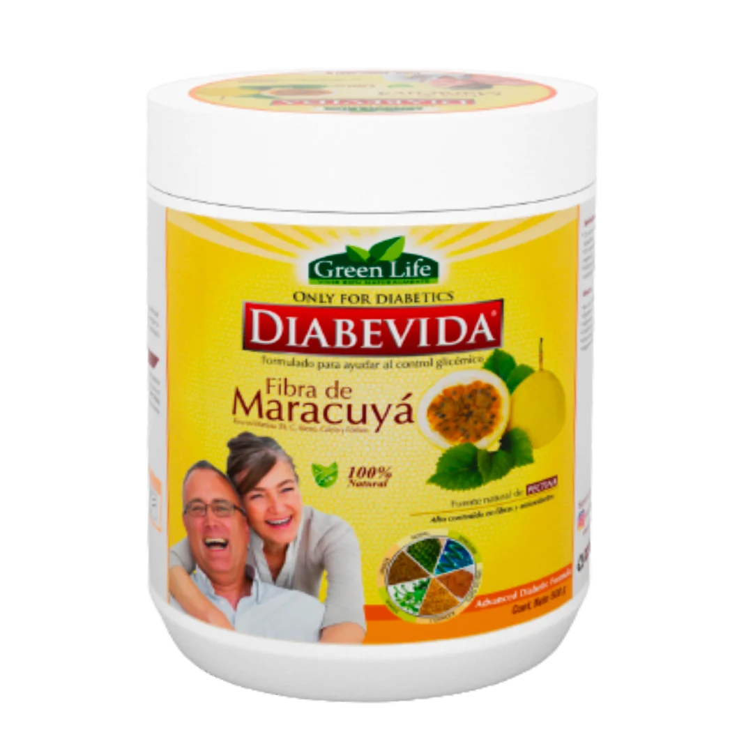 Diabevida Fibra de Maracuyá 500g Green Life es un tratamiento coadyuvante diseñado para apoyar a pacientes con hiperglucemia. Su fórmula natural incluye ingredientes como nopal, spirulina, uña de gato, ajonjolí, stevia y linaza, conocidos por sus beneficios para la salud metabólica y digestiva. Se recomienda consumir 2 cucharadas en ayunas y 2 cucharadas en la tarde, mezcladas con agua o jugos según preferencia, para obtener mejores resultados.