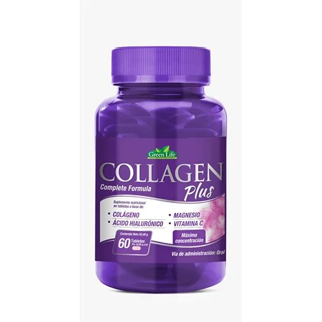 El DUO PACK Collagen Plus de Green Life contiene 60 tabletas que ayudan a mantener la elasticidad e hidratación de la piel. Además, este suplemento apoya el mantenimiento de huesos, articulaciones, dientes y el funcionamiento normal del sistema muscular y nervioso. Está compuesto por magnesio, colágeno hidrolizado, ácido hialurónico y vitamina C, entre otros ingredientes estabilizantes y antiaglutinantes.